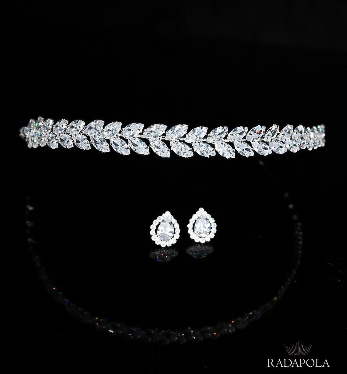 Комплект от тънка нежна тиара и обеци с цирконий. Изработени са ръчно от висококачествени материали. Размерът на тиарата може да бъде регулиран, за да бъде удобна за всеки, а обеците се закопчават с винт.