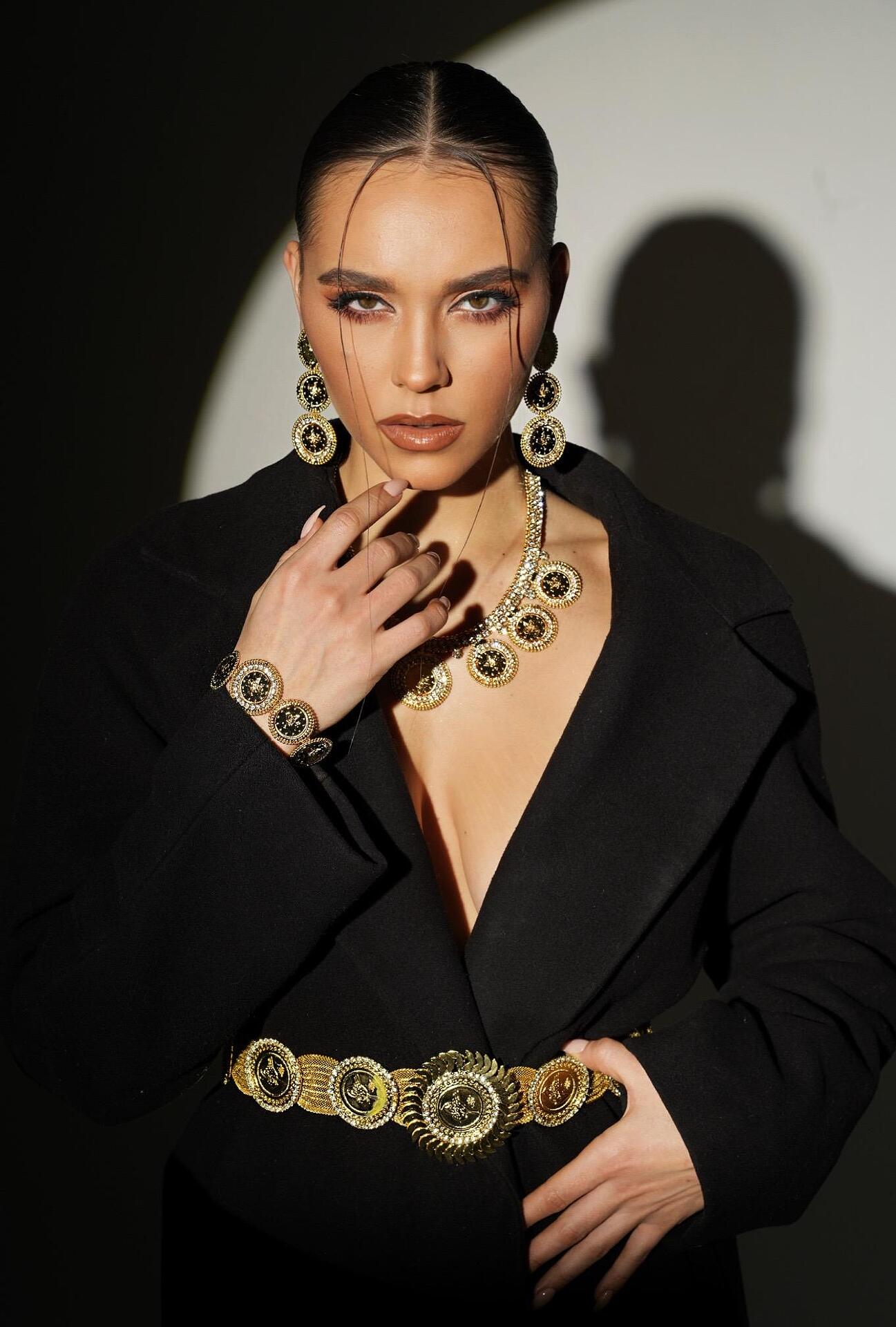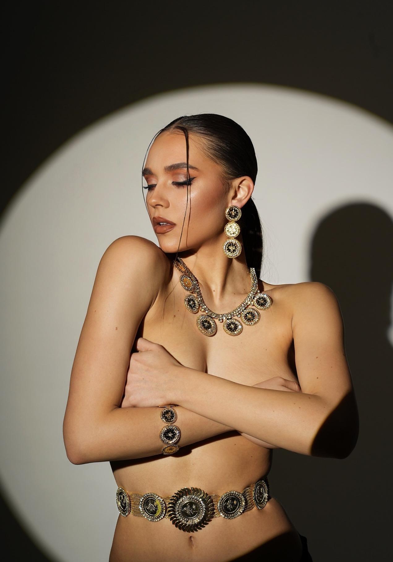 Златист комплект от обеци, колие, гривна и колан с кристали и орнаменти. Колието и колана се регулират спрямо желания от вас размер. Подходящи за различни видове поводи. Могат да се носят както по отделно, така и като комплект.