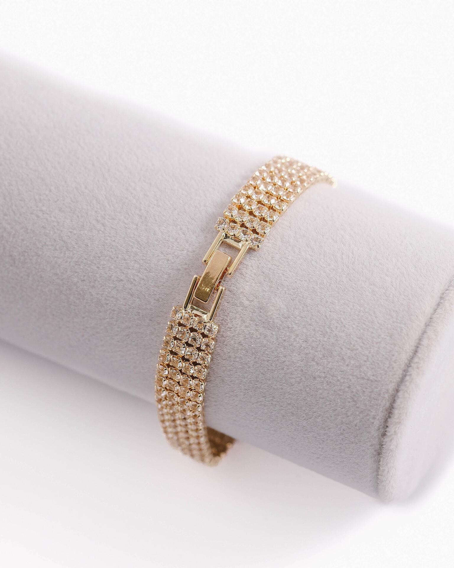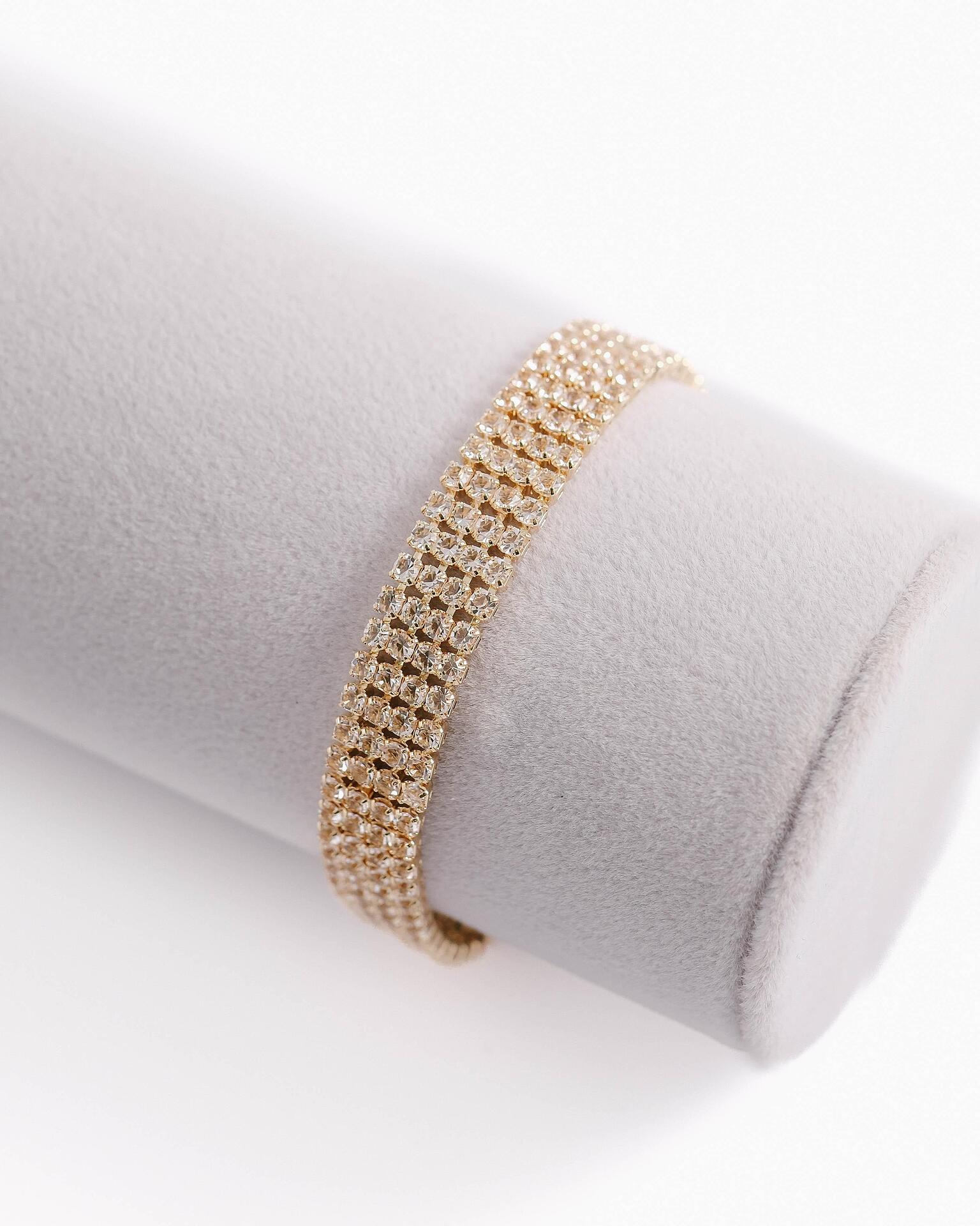 Златиста тънка гривна, обсипана с четири реда множество малки камъчета. Не потъмнява. С елегантно закопчаване.