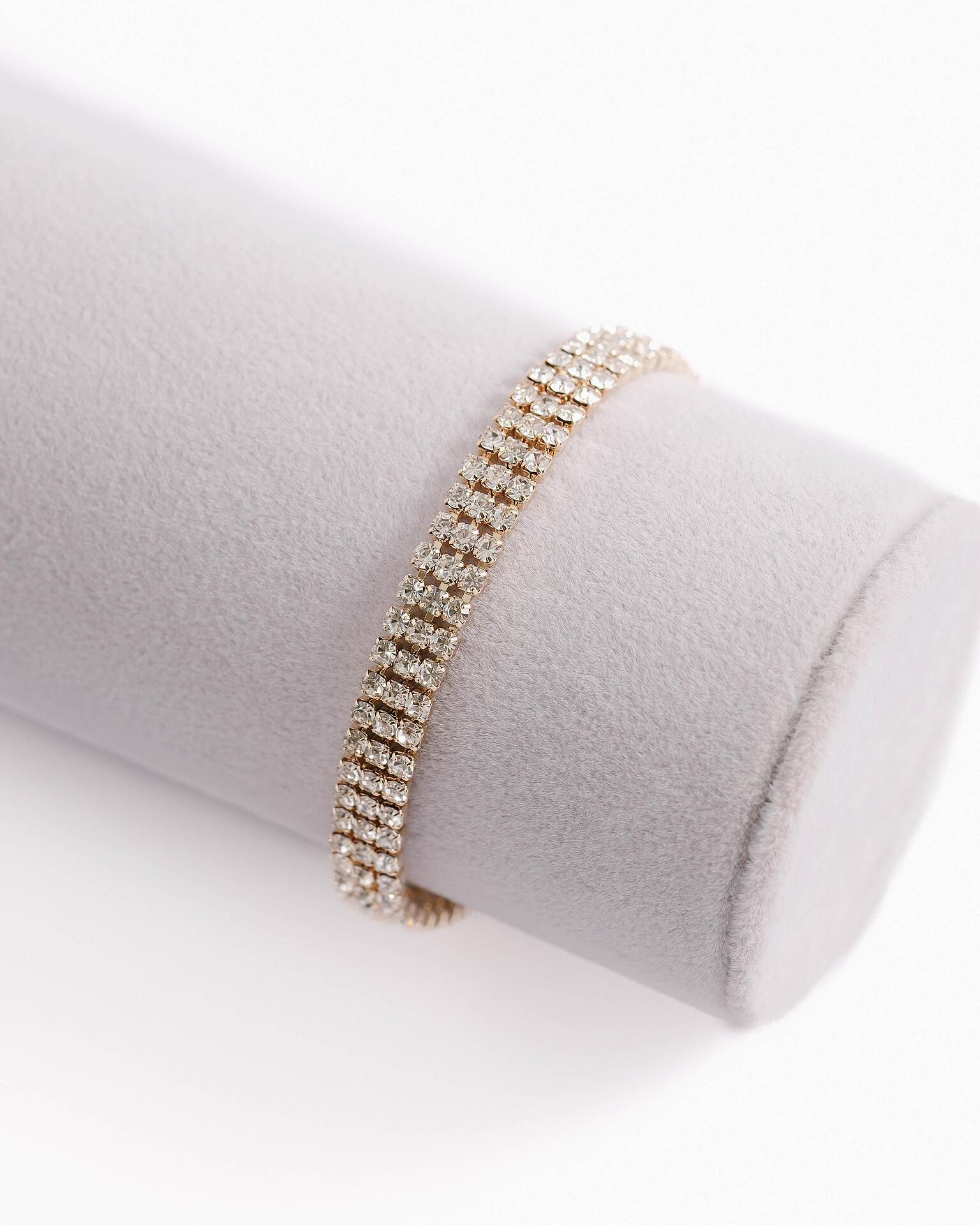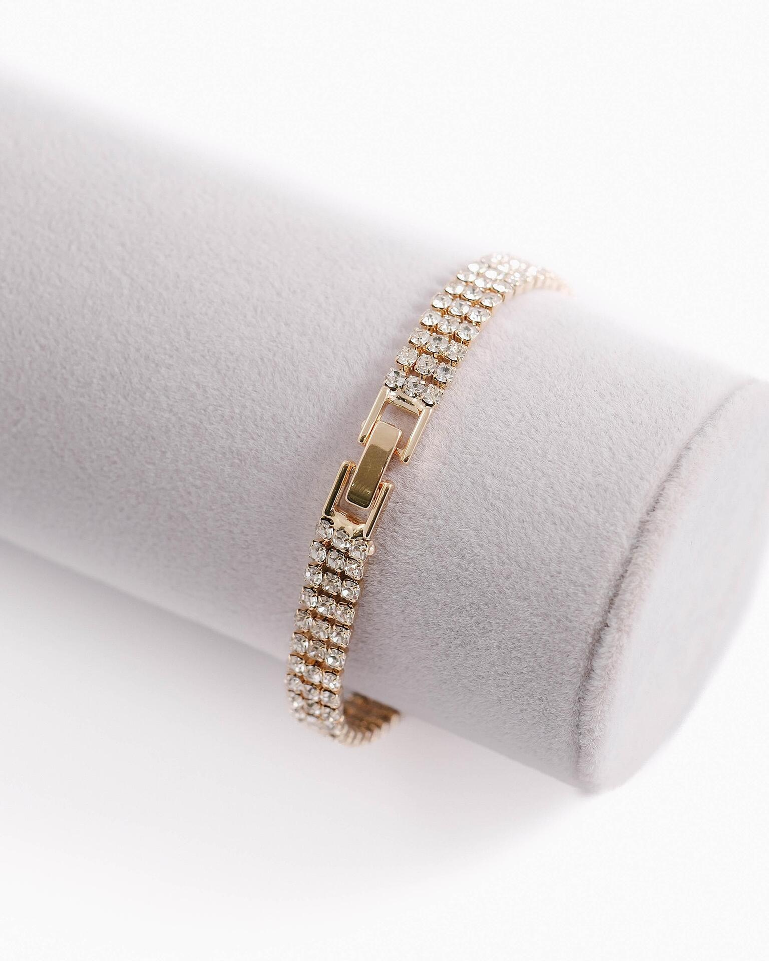 Златиста тънка гривна, обсипана с множество малки камъчета, които променят цвета си на светлина. Не потъмнява. С елегантно закопчаване.