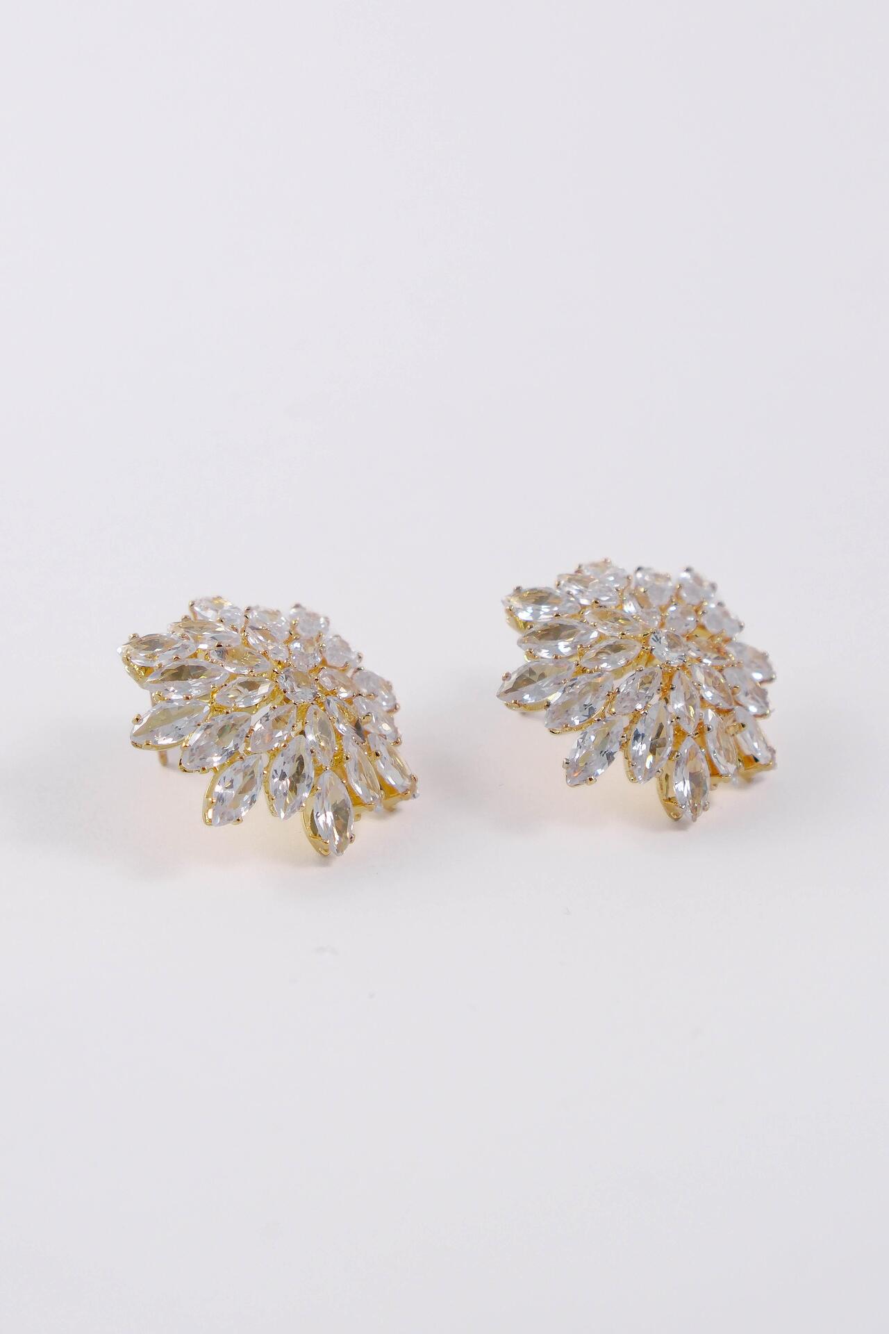 Обеци във формата на разпръснато цвете със стъклени кристали. Елегантни и подходящи за много поводи. Закопчават се с винт.